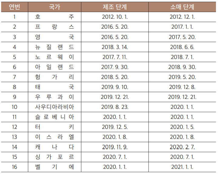 | 표 3 | 광고 없는 표준 담뱃갑 제도 도입 국가 현황(소매 단계 빠른 순 정렬)
