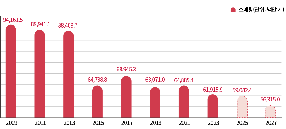 [그림 1] 우리나라 일반담배(궐련) 판매량(2009-2028) 추계
