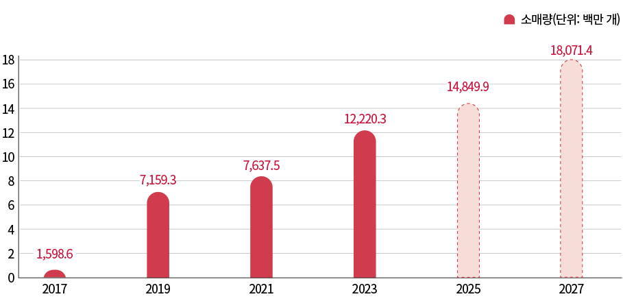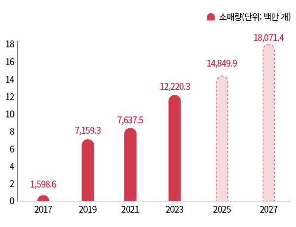 궐련형 전자담배는 2017년 시장 도입 시 15억 9,860만 개비에서 2024년 134억 6,800만 개비로 증가하였다.