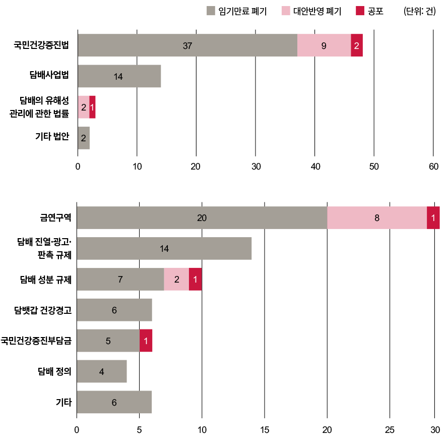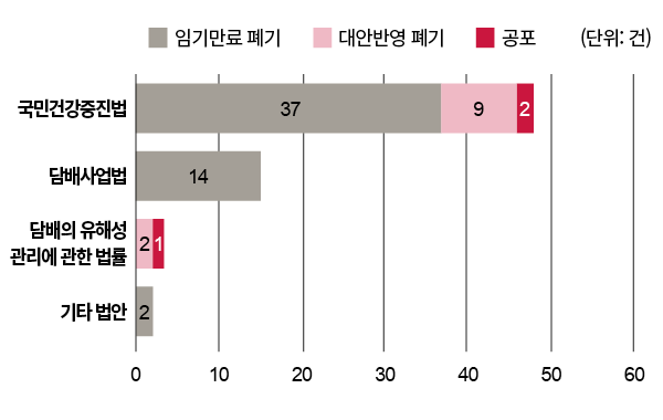 (약 55.3%)이 담배에 관한 사항으로, 우리나라 담배규제정책 강화 분위기를 엿볼 수 있다. 그러나, 담배 문제로부터 국민 건강을 보호하기에는 많은 현안들이 여전히 해결되지 못한 채로 남아 있다. 2024년 5월 임기가 종료된 제21대 국회에서는 국민건강증진법 48건, 담배사업법 14건, 담배의 유해성 관리에 관한 법률 3건, 기타 2건 등 담배 관련 법안이 총 67건 발의되었는데, 이 중 공포된 법안은 3건에 불과했으며, 대안 반영 폐기 11건, 임기 만료 폐기 53건이었다. 정책별로는 금연구역 관련 법안이 29건으로 가장 많았으며, 담배 진열·광고·판촉 규제가 14건, 담배 성분 규제가 11건 순으로 많았는데, 대부분 법안이 통과되지 못하고 폐기 절차를 밟았다.