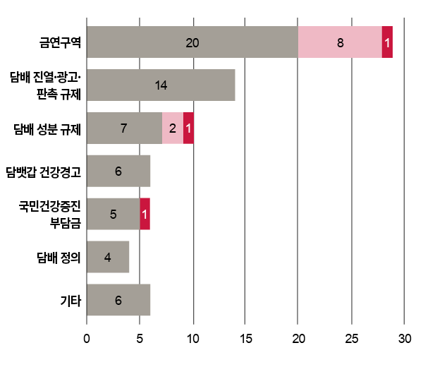 한편, 우리나라의 경우에도 유사한 논의가 있었다. 지난 2019년 5월, 우리나라 정부는 ‘흡연을 조장하는 환경 근절을 위한 금연종합대책’을 발표하였다. 금연종합대책에 포함된 중점 추진 방향은 ❶ 담배 광고·판촉행위 제한 강화, ❷ 담배 등 니코틴 함유 제품 및 흡연 전용 기구 규제 강화, ❸ 국민 건강 보호를 위해 간접흡연 적극 차단, ❹ 흡연 예방 교육 및 금연 치료 강화, ❺ 담배규제정책의 과학적 기반 마련 및 국제 협력 강화가 있다.