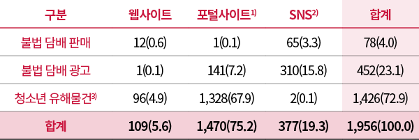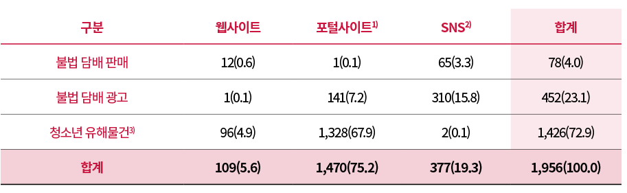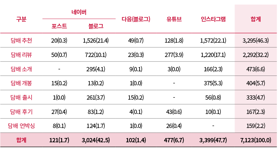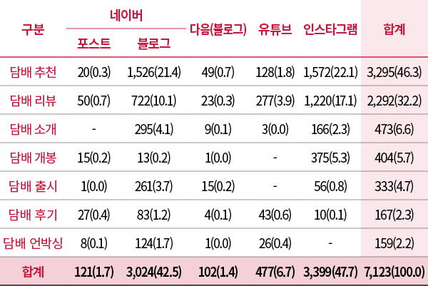 또한, 네이버(포스트, 블로그), 다음(블로그), 유튜브, SNS(인스타그램)에서 담배 관련 키워드로 검색된 총 7,123개 페이지를 대상으로 영리 목적으로 담배제품의 사용경험이나 이용 정보를 제공하는 행위를 모니터링한 결과, 담배 추천 게시글 혹은 동영상이 3,295건(46.3%)으로 가장 많이 게시되었고, 다음으로는 담배 리뷰 2,292건(32.2%), 담배 소개 473건(6.6%), 담배 개봉 404건(5.7%), 담배 출시 333건(4.7%) 순으로 확인되었다.