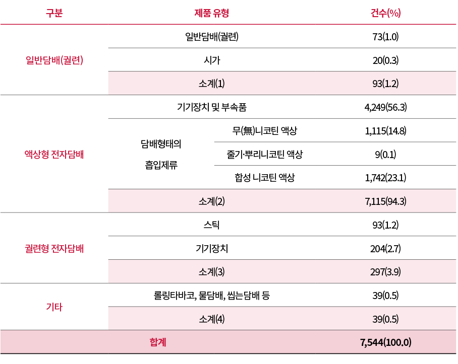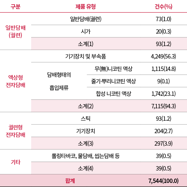 담배제품 유형별로 확인하였을 때에는, 액상형 전자담배 기기장치 및 부속품이 4,249건(56.3%)으로 절반 이상을 차지하였고, 담배형태의 흡입제류(2,886건, 38.0%)와 궐련형 전자담배 스틱 및 기기장치(297건, 3.9%)가 뒤를 이었다.