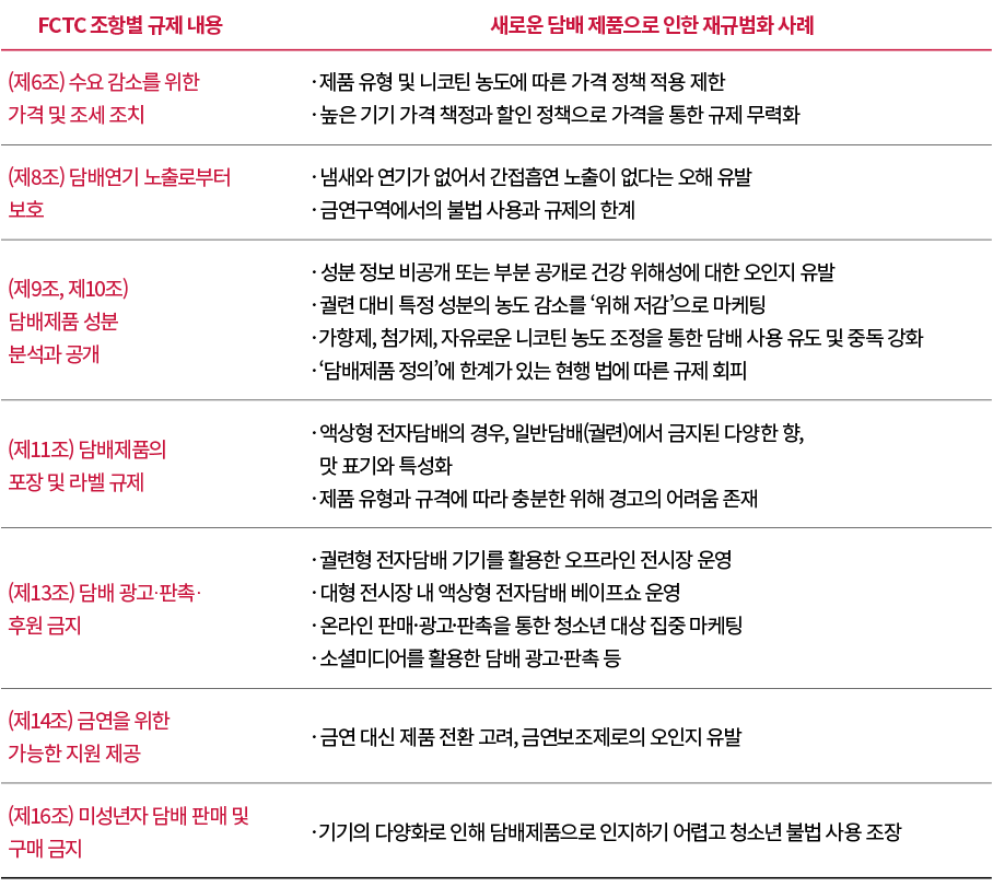 이러한 담배업계의 담배제품의 재규범화 시도를 차단하고 담배규제 강화를 위한 분위기를 재점화하기 위해서는 현행 규제의 허점을 보완해나가는 노력과 동시에 보다 강력하고 효과적인 규제방안을 개발하는 노력이 필요하다. 우선적으로는 세계보건기구 담배규제기본협약
