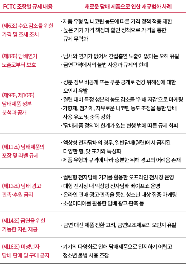담배규제 강화를 위한 입법 노력이 정체되는 상황을 틈타 새로운 담배제품 유형과 이를 토대로 한 마케팅 전략은 우리나라에서 수십 년 동안 추진해온 담배규제 노력이 무색할 정도로 계속해서 진화하고 있다. 연초