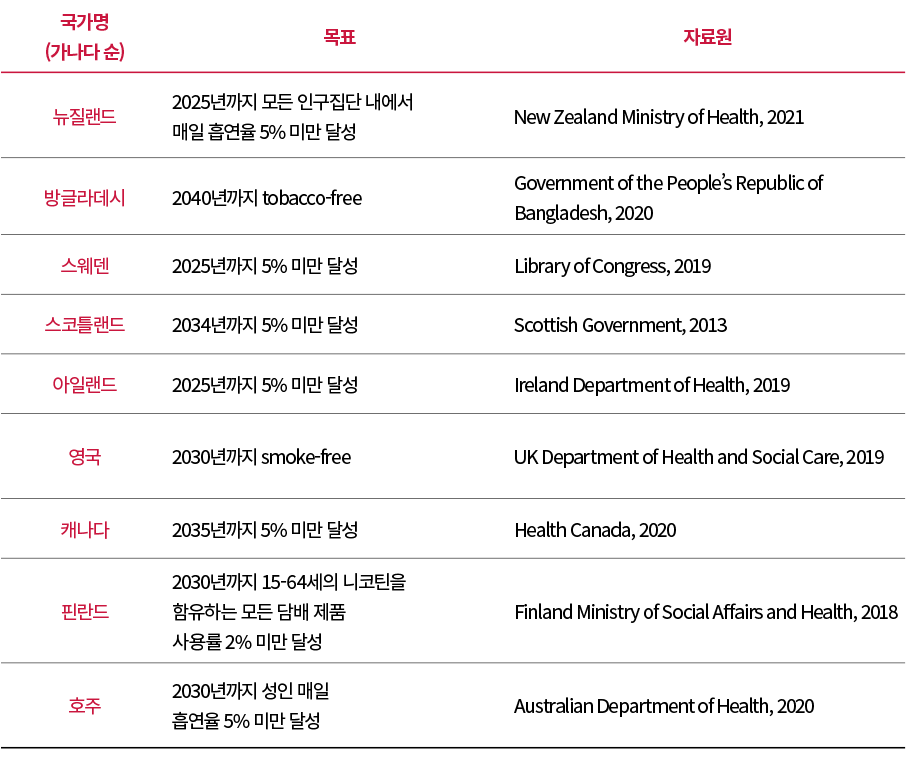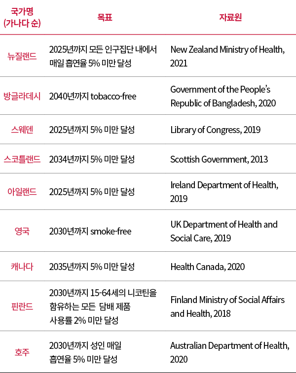 담배 위험으로부터 아동·청소년을 완전하게 보호하기 위한 이른바 ‘담배 없는 미래세대’를 위한 정책적 노력은 전 세계적인 추세로 보아도 무방할 정도로 수많은 국가에서 발표된 바 있다. 2023년 기준, 정해진 기간 내에 5% 미만의 흡연율 혹은 담배제품 사용률 달성을 목표로 수립한 국가는 ❶ 네덜란드, ❷뉴질랜드, ❸ 말레이시아, ❹ 방글라데시, ❺ 스웨덴, ❻ 아일랜드, ❼ 영국(스코틀랜드 포함), ❽ 캐나다, ❾핀란드, ❿ 호주로 총 10개국에 달한다.