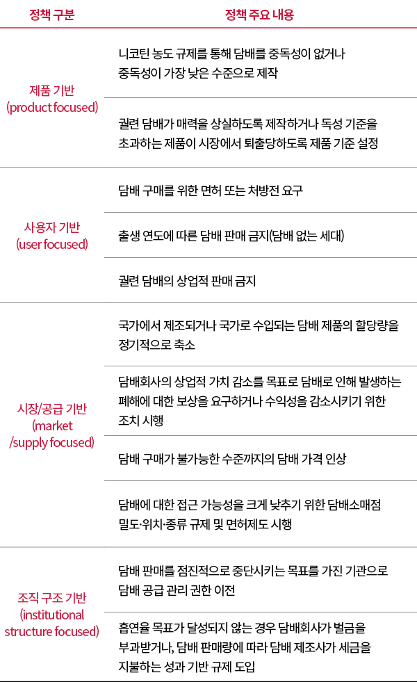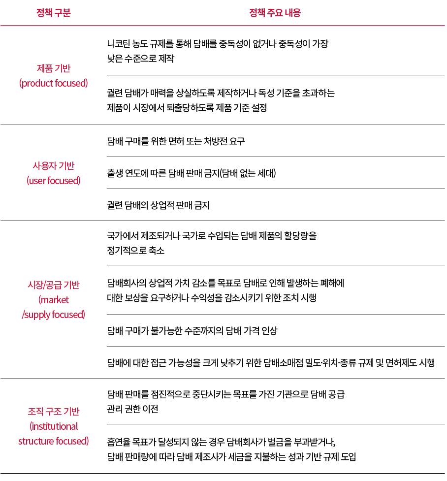 이와 같은 국가들은 담배제품 사용을 점진적으로 규제하는 것을 넘어, 사회에서 빠른 시일 내에 “제거”하는 것을 목표로 하고 있다. 이를 달성하기 위하여 각국은 여러 담배규제 정책을 추진하고 있다. 각국에서 추진하고자 하는 정책 사례별로는 크게 제품 기반, 사용자 기반, 시장·공급 기반으로 구분하여 살펴볼 수 있다. 이러한 정책 구분은 2022년 Puljević 등이 담배규제 정책 관련 문헌을 검토하여 그룹화할 때 사용된 범주이다.