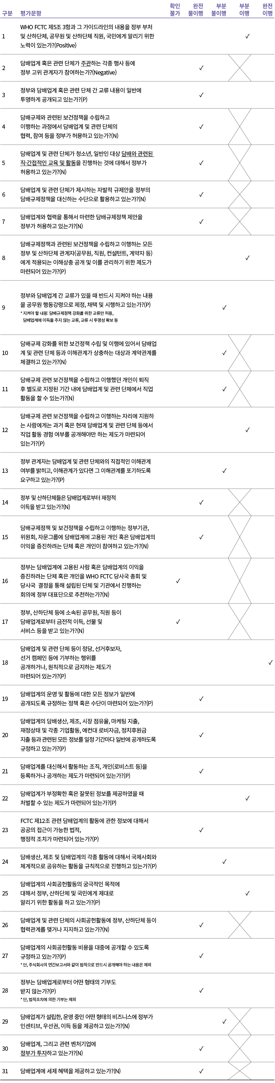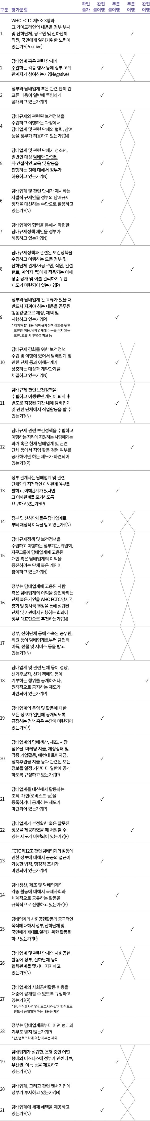 [표 1] 2023년 WHO FCTC 제5조 3항 가이드라인 국내 이행현황 평가 결과