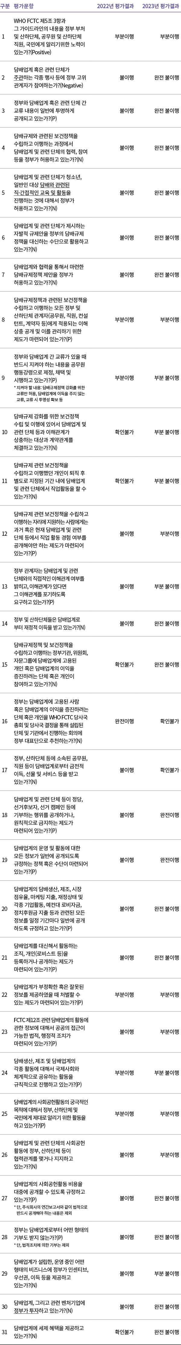 2022년과 2023년 WHO FCTC 제5조 3항 가이드라인 국내 이행현황 평가 비교표는 [표 2]와 같다.