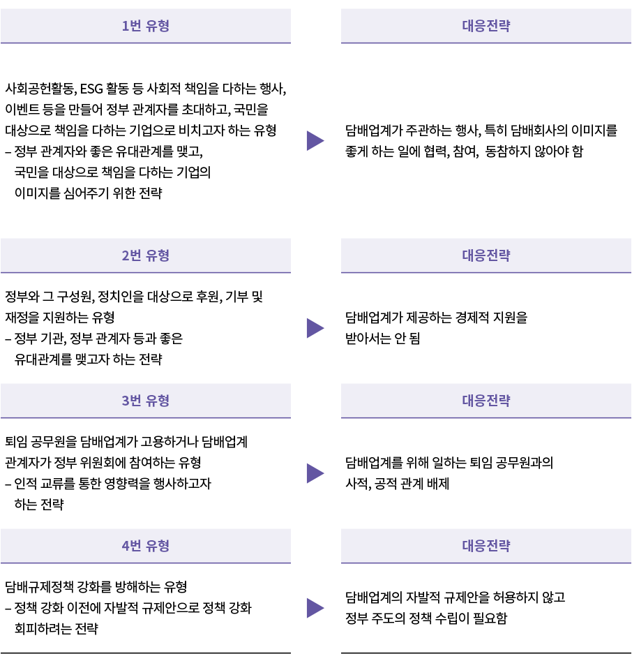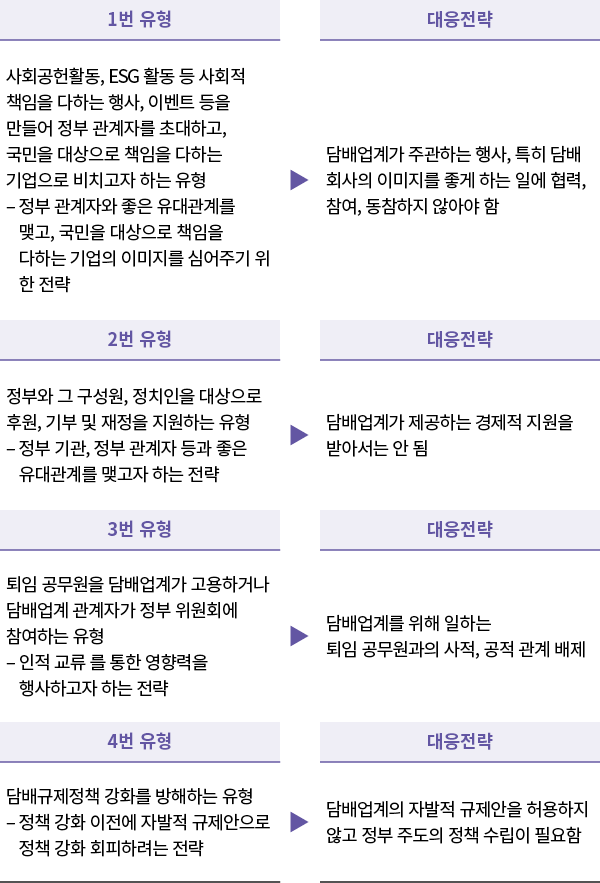 담배업계의 담배규제정책 약화 전략의 1번부터 4번까지 유형별 대응 전략은 다음과 같다. 1번 유형은 사회공헌활동, ESG 활동 등 사회적 책임을 다하는 행사, 이벤트 등을 만들어 정부 관계자를 초대하고, 국민을 대상으로 책임을 다하는 기업으로 비치고자 하는 유형이다. 1번 유형에 대한 대응 전략으로는 담배업계가 주관하는 행사, 특히 담배회사의 이미지를 좋게 하는 일에 협력, 참여, 동참하지 않는 것이다. 2번 유형은 정부와 그 구성원, 정치인을 대상으로 후원, 기부 및 재정을 지원하는 유형이다. 2번 유형에 대한 대응 전략으로는 담배업계가 제공하는 경제적 지원을 받지 않는 것이다. 3번 유형은 퇴임 공무원을 담배업계가 고용하거나 담배업계 관계자가 정부 위원회에 참여하는 유형이다. 3번 유형에 대한 대응 전략으로는 담배업계를 위해 일하는 퇴임 공무원과의 사적, 공적 관계를 배제하는 것이다. 4번 유형은 담배규제정책 강화를 방해하는 유형이다. 4번 유형에 대한 대응 전략으로는 담배업계의 자발적 규제안을 허용하지 않고 정부 주도의 정책 수립을 추진하는 것이다.